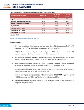 Table 5: Singapore FOB, refined product prices ($/bbl) in September 2025
